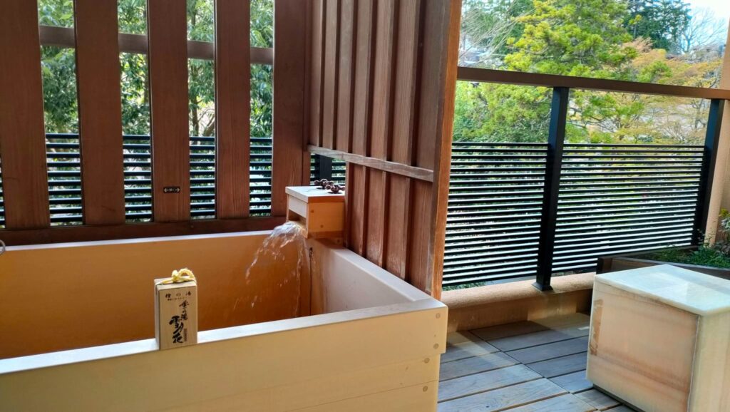 箱根登山鉄道の「強羅駅」から徒歩1分の好立地と、全室檜の露天風呂付きの客室が特徴です。