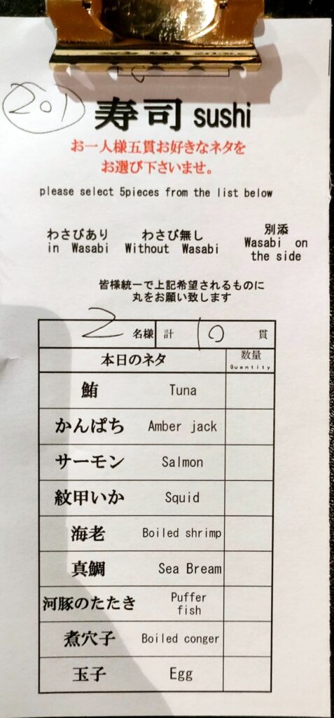 お好み寿司は一人5貫まで好きな寿司を選んで注文します。