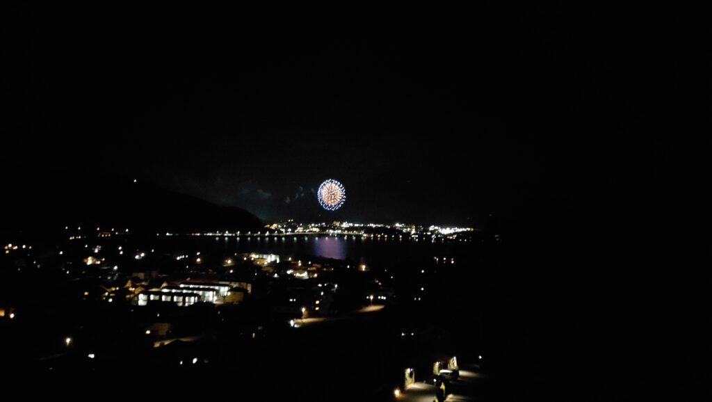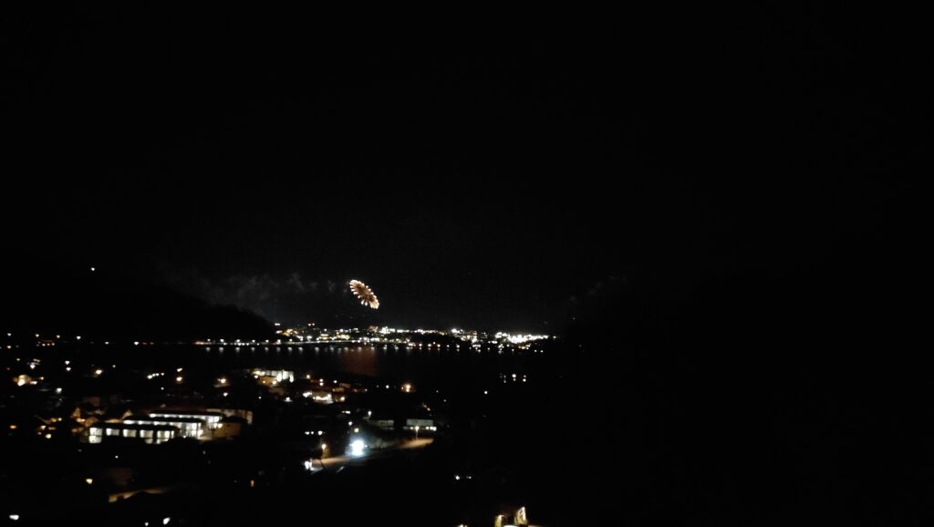 部屋から見る河口湖冬花火