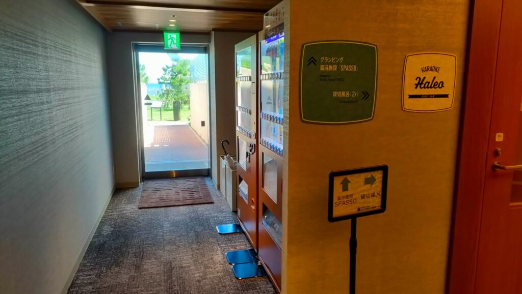 温浴施設へ行くには1階廊下を通って外に出ます。