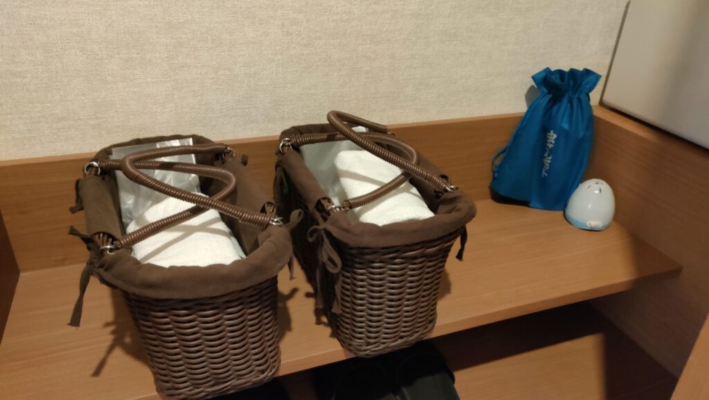 温浴施設、貸切風呂にバスタオルはないので、客室からバスタオルの入った湯かごを持参しましょう。