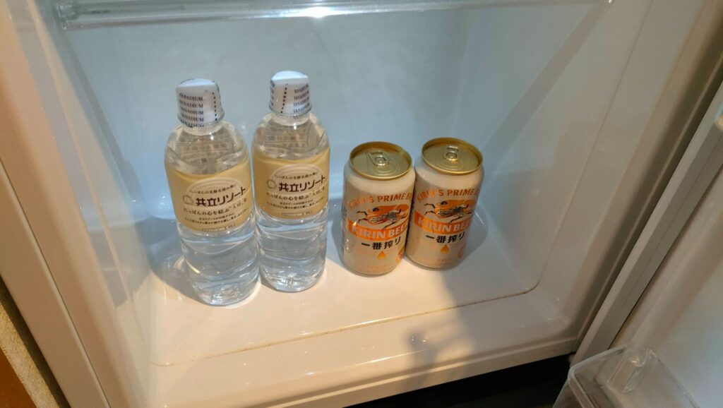 冷蔵庫には無料サービスのミネラルウォーターとビールが入っています。