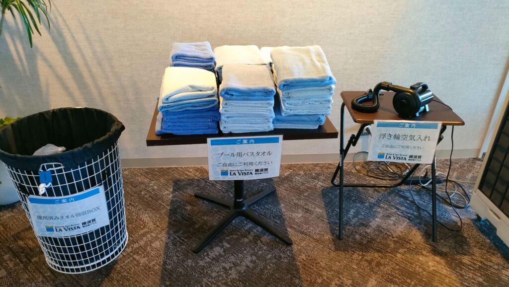 プールの入り口前には無料のバスタオル貸し出しがあります。